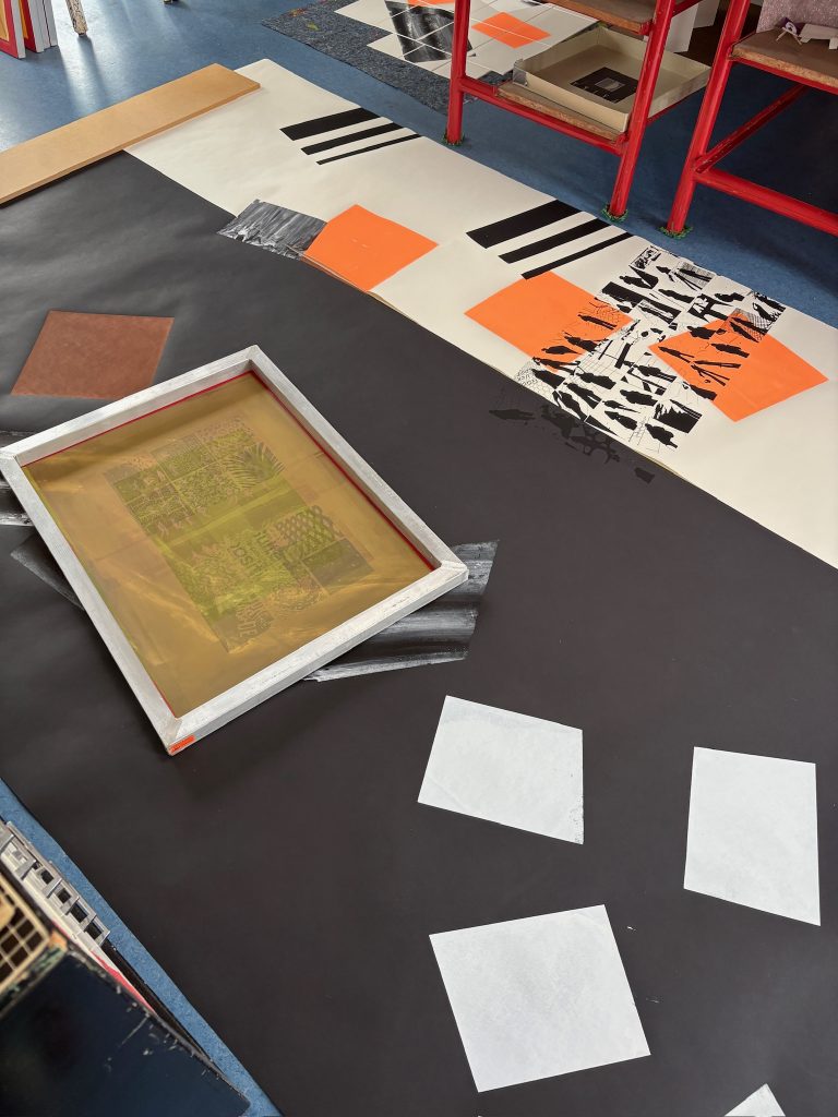 „Drei zu Eins“ zeigt eine kollektive Siebdruckarbeit, welche zuvor im Atelier entstanden ist. 6 Bahnen Papier, abwechselnd schwarz und weiß, wurden mit verschiedenen Sieben der Künstlerinnen bedruckt und ergeben schließlich eine große, zusammenhängende Arbeit, die dann im Leerstand in den Fenstern präsentiert wurde.